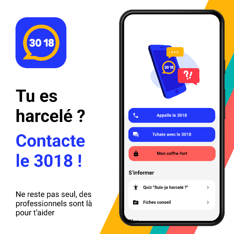 Victime de cyber harcèlement qui appeler ? Contacte le 3018 c'est gratuit, anonyme, confidentiel. L'application 3018 peut t'aider.