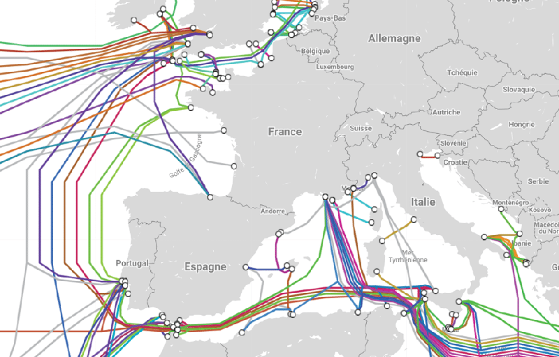 Début août, une grue sous-marine travaillant à la collecte de sable dans la baie de Kuakata a heurté un câble sous-marin de télécommunications, se traduisant par une perte de 40 % de la vitesse du réseau internet du Bangladesh. En juillet dernier, la Somalie a été totalement privée d’Internet pendant plusieurs heures en raison d’une opération de maintenance à distance du câble sous-marin dénommé « EASSy » qui relie la côte est-africaine au réseau. Ces événements ne sont pas anodins à l’échelle d’un pays : les banques, les compagnies aériennes, les entreprises, les médias et certains services gouvernementaux sont dépendants d’Internet pour fournir leurs services. Aujourd’hui, 98 % des données numériques mondiales circulent par les câbles sous-marins. C’est par exemple le cas du principal système d’échanges de la finance mondiale de la Society for Worldwide Interbank Financial Telecommunications (SWIFT) qui dépend de la vitesse de ces câbles à fibre optique.Le numérique repose ainsi sur une infrastructure bien réelle : on dénombre aujourd’hui 473 câbles sous-marins de télécommunication, dont 25 traversent l’océan Atlantique et 22 le Pacifique[1]. Passerelles intercontinentales entre les différents réseaux filaires nationaux, les câbles sous-marins débouchent sur des stations d’atterrissement situées en région côtière. La France compte, par exemple, 13 stations d’atterrissement sur son territoire côtier connectant les réseaux filaires nationaux à 23 câbles sous-marins. Ces “routes du fond des mers”, selon l’expression de Florence Smits et Tristan Lecoq en 2017[2], sont les héritiers des premiers câbles télégraphiques du XIXe siècle dont l’emploi permit, en 1858, l’envoi du premier message télégraphique officiel par la reine Victoria au président américain James Buchanan. Le message de 509 lettres avait alors mis 17 heures et 40 minutes à traverser l’océan Atlantique. Aujourd’hui, la fibre optique permet un acheminement de l’information en temps quasi-réel. %